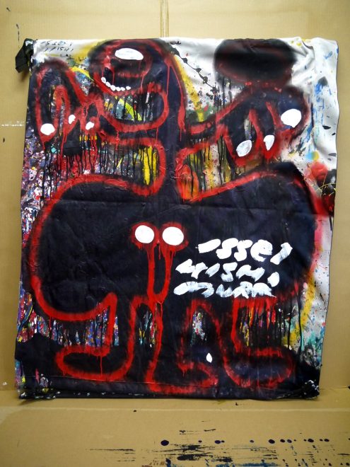 「ムンクなLOGO」裏返したカンバスに化繊布の上張りF5020210302