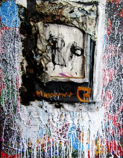 「放火容疑」カンバスと合繊布、新聞紙のコラージュF5020211218